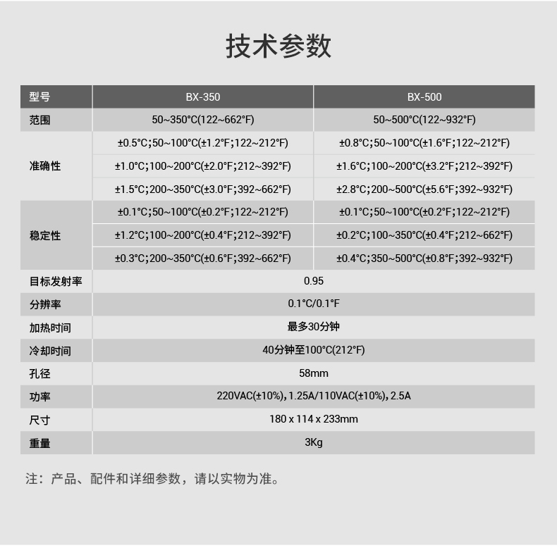 BX-350校準(zhǔn)溫度為50℃~350℃;BX-500校準(zhǔn)溫度為50℃~500℃;