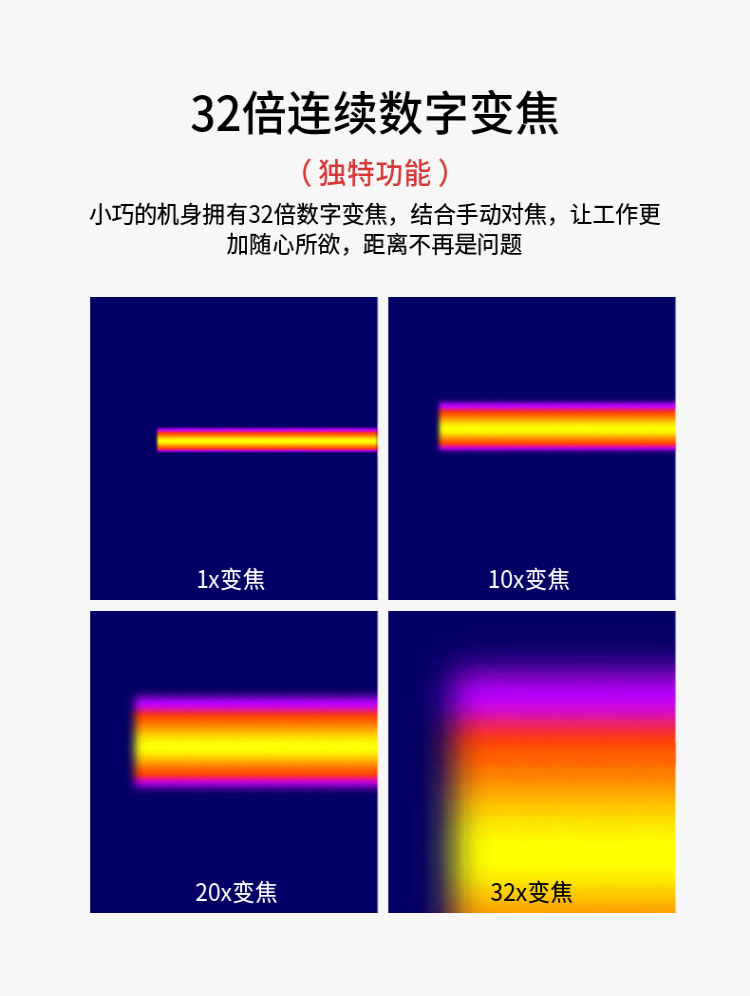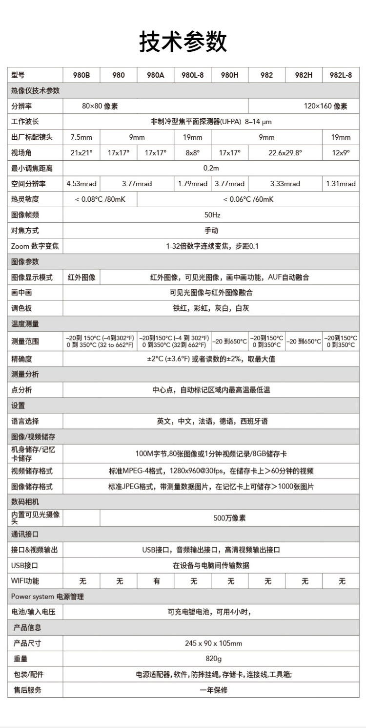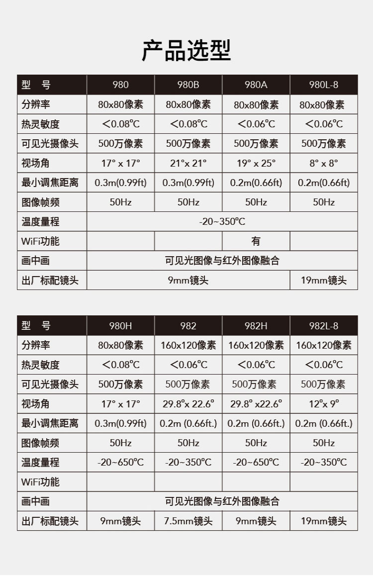 標(biāo)配鏡頭9mm,分辨率80×80,IFOV:3.77mard,視場角17×17°,熱靈敏度NETD<0.06℃,圖像幀頻50Hz,溫度范圍(-20-150、0-350),可見光分辨率500萬像素