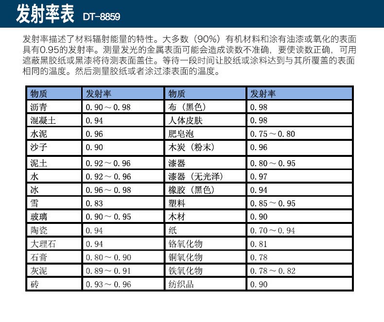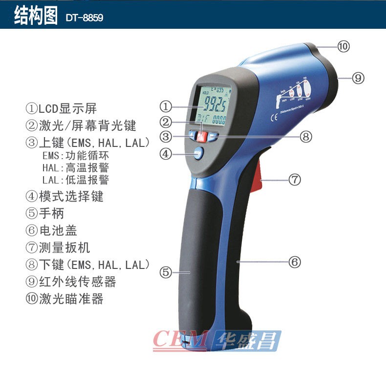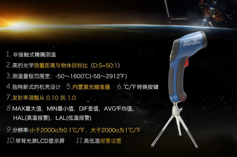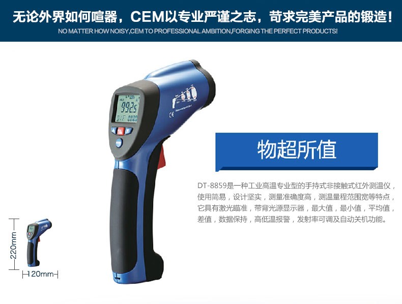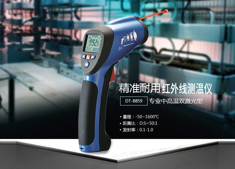 DT-8829紅外線測(cè)溫儀一種專(zhuān)業(yè)型的手持式非接觸紅外線測(cè)溫儀,使用簡(jiǎn)易,設(shè)計(jì)堅(jiān)實(shí),測(cè)量準(zhǔn)確度高,測(cè)溫量程范圍寬等特點(diǎn)。它具有激光瞄準(zhǔn),帶背光源顯示器,最大值,最小值,平均值,差值,數(shù)據(jù)保持,高低溫報(bào)警,發(fā)射率可調(diào)及自動(dòng)關(guān)機(jī)功能。該手持式非接觸紅外線測(cè)溫儀可用于測(cè)量那些不適合使用傳統(tǒng)接觸式測(cè)量方法來(lái)測(cè)量物體的表面溫度(例如移動(dòng)物體,帶電表面和難以接觸到的物體)。特征:非接觸式精確測(cè)溫高的光學(xué)測(cè)量距離與物體目標(biāo)比(D:S-16;1/50:1)測(cè)溫量程范圍寬獨(dú)特新式的機(jī)殼設(shè)計(jì)內(nèi)置激光瞄準(zhǔn)器自動(dòng)數(shù)值保持℃/F轉(zhuǎn)換按鍵發(fā)射率調(diào)整從0.10 到1.0,(8829固定在0.95)MAX,MIN,DIF,AVG 溫度顯示帶背光源LCD顯示屏自動(dòng)選擇量程,分辨率為0.1