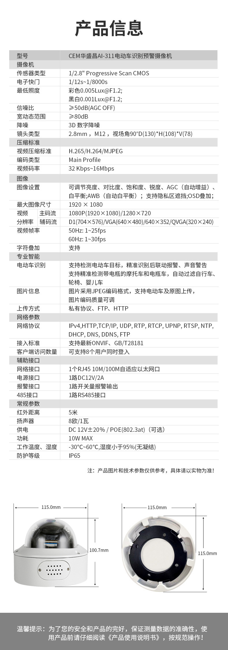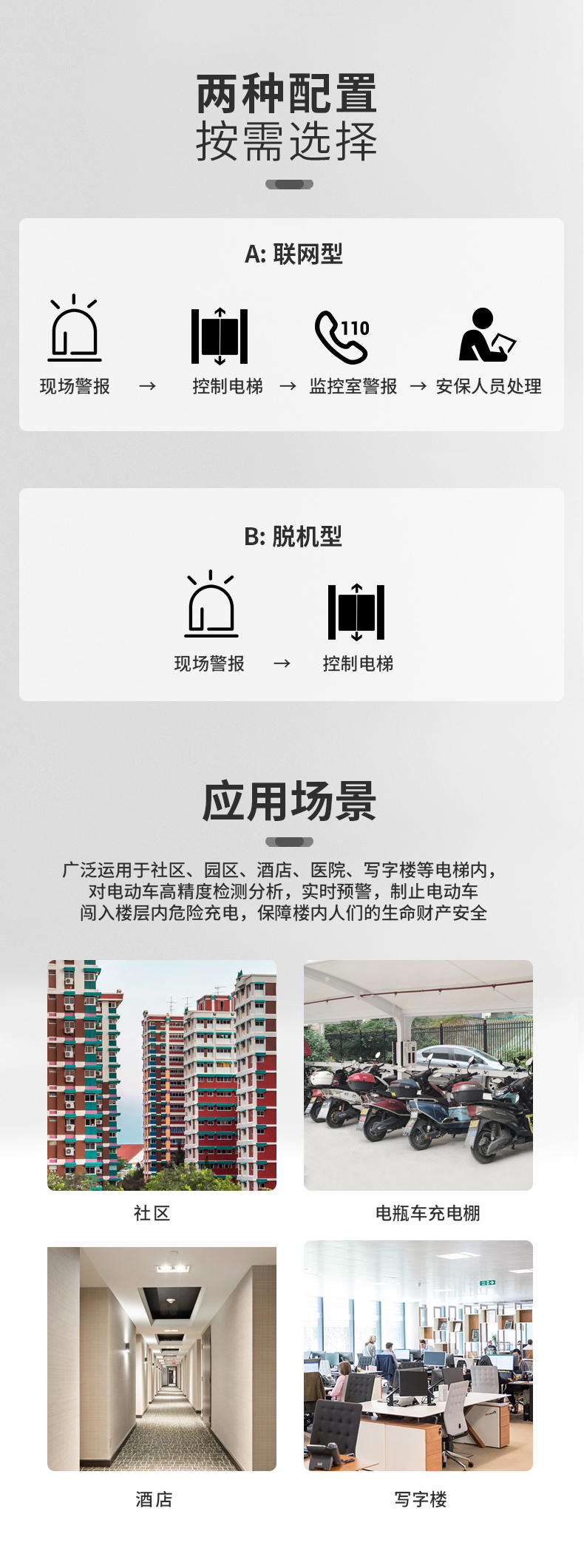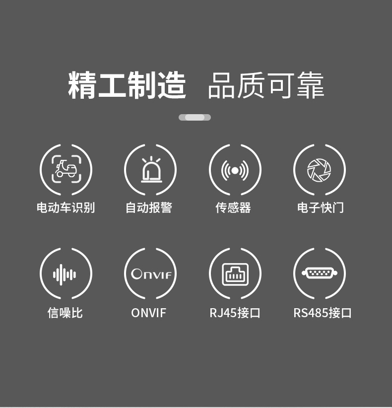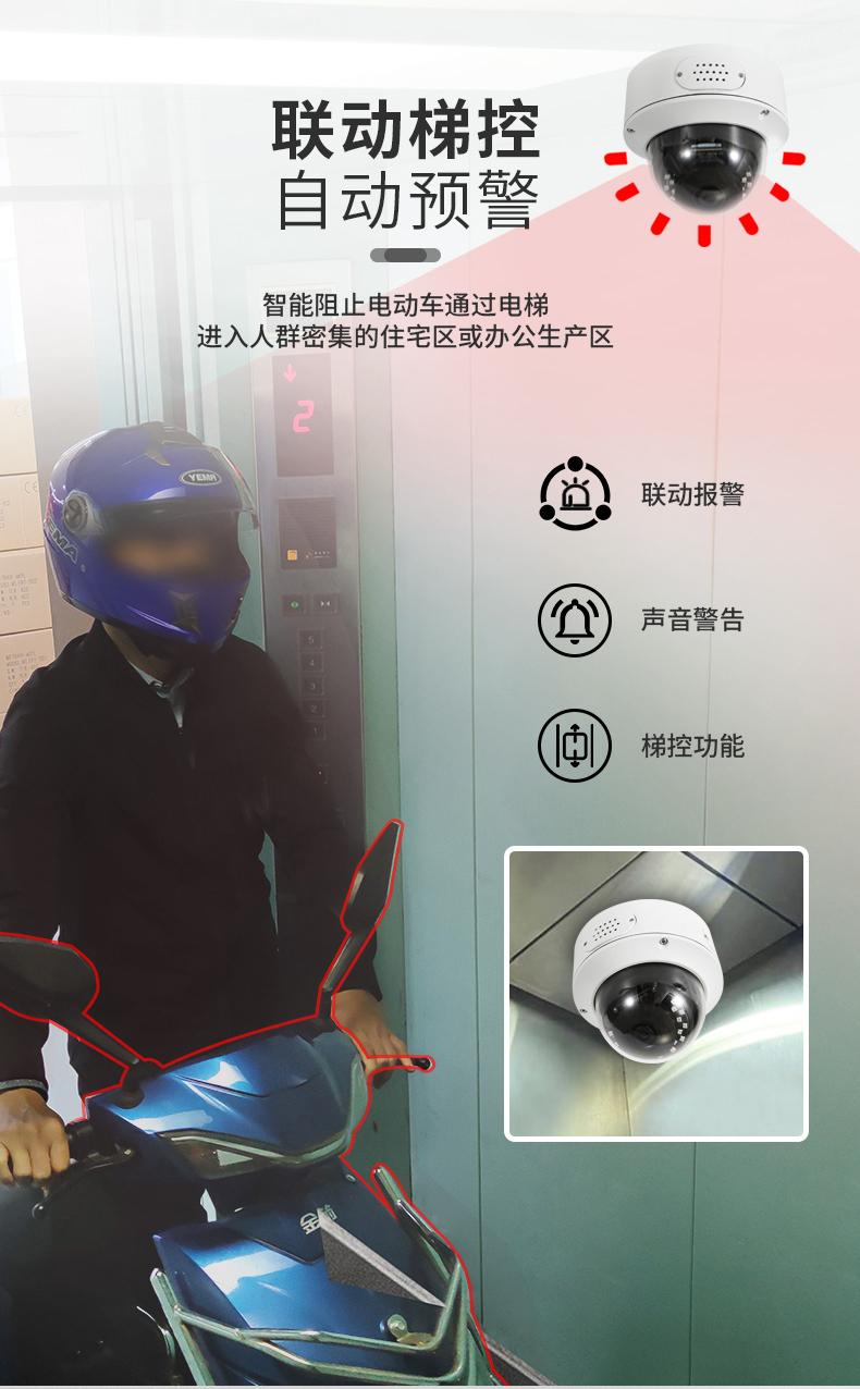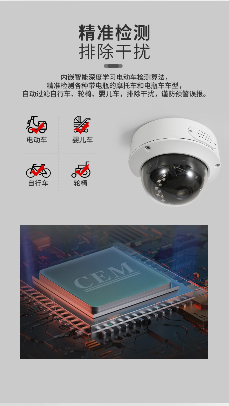 電動車識別預警攝像機:電動車識別預警攝像機設備嵌入電動車識別算法,實現(xiàn)對電動車檢測分析識別,實時預警周界區(qū)域內電動車闖入事件,前端攝像機一體化完成分析、識別、預警,并上傳平臺。